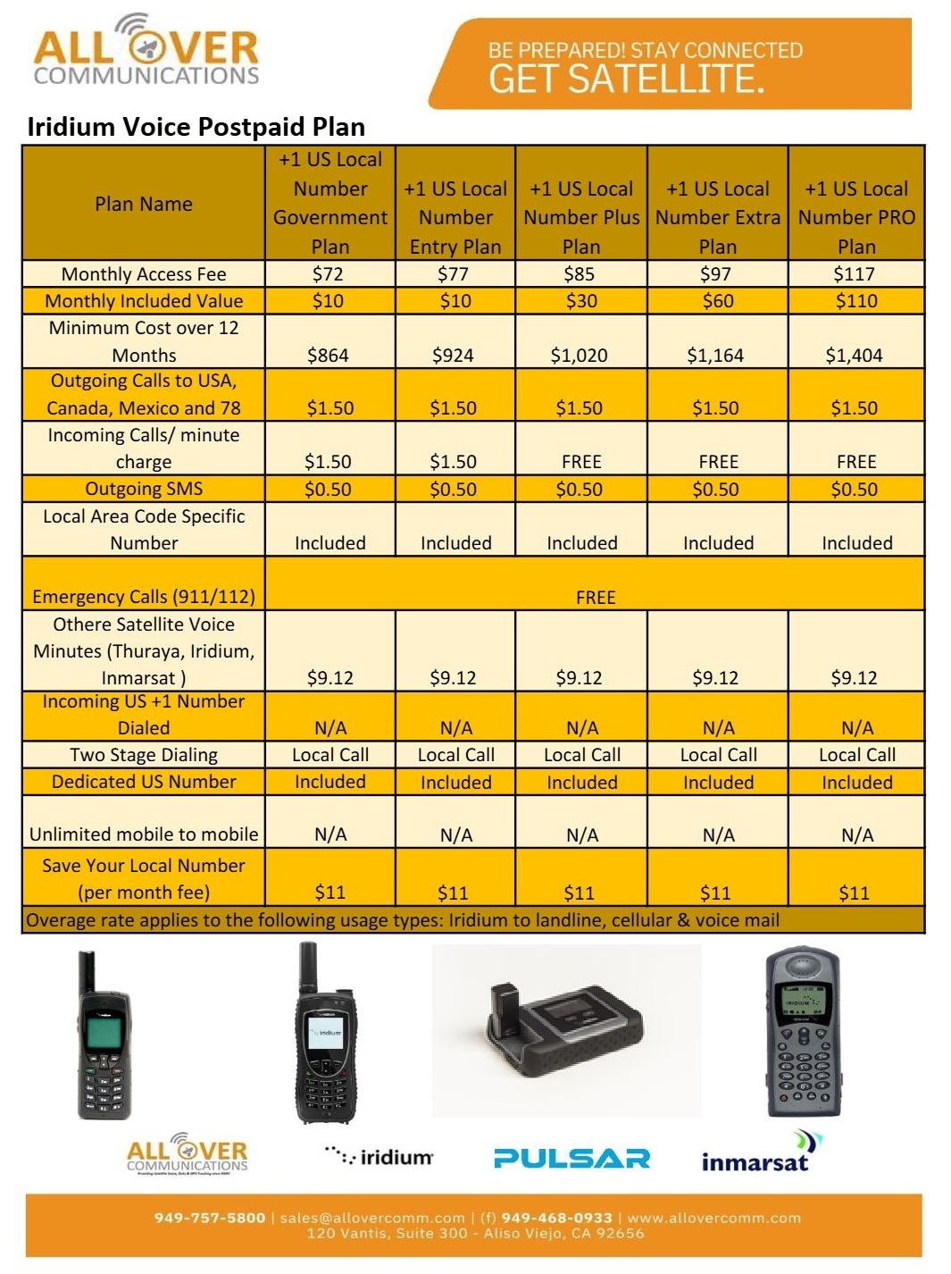 We set up the account (download application here), provide you with the SIM card and telephone number. With All Over Communications, you can deactivate your service, pay $11 per month to keep your local number. When ready to re-activate, we reconnect your SIM card at no additional charge, and we will restore your local number! Also, FREE INCOMING CALLS (most plans) are included. FREE activation, FREE SIM card on any activation! $10.95 shipping fee will be refunded when sim card is activated on any rate plan. Please specify which plan you want to activate on in checkout. We will need credit application (download here) filled out prior to shipping SIM card. Please review the plans below. Email completed apps to sales@allovercomm.com or fax to 949-468-0933.