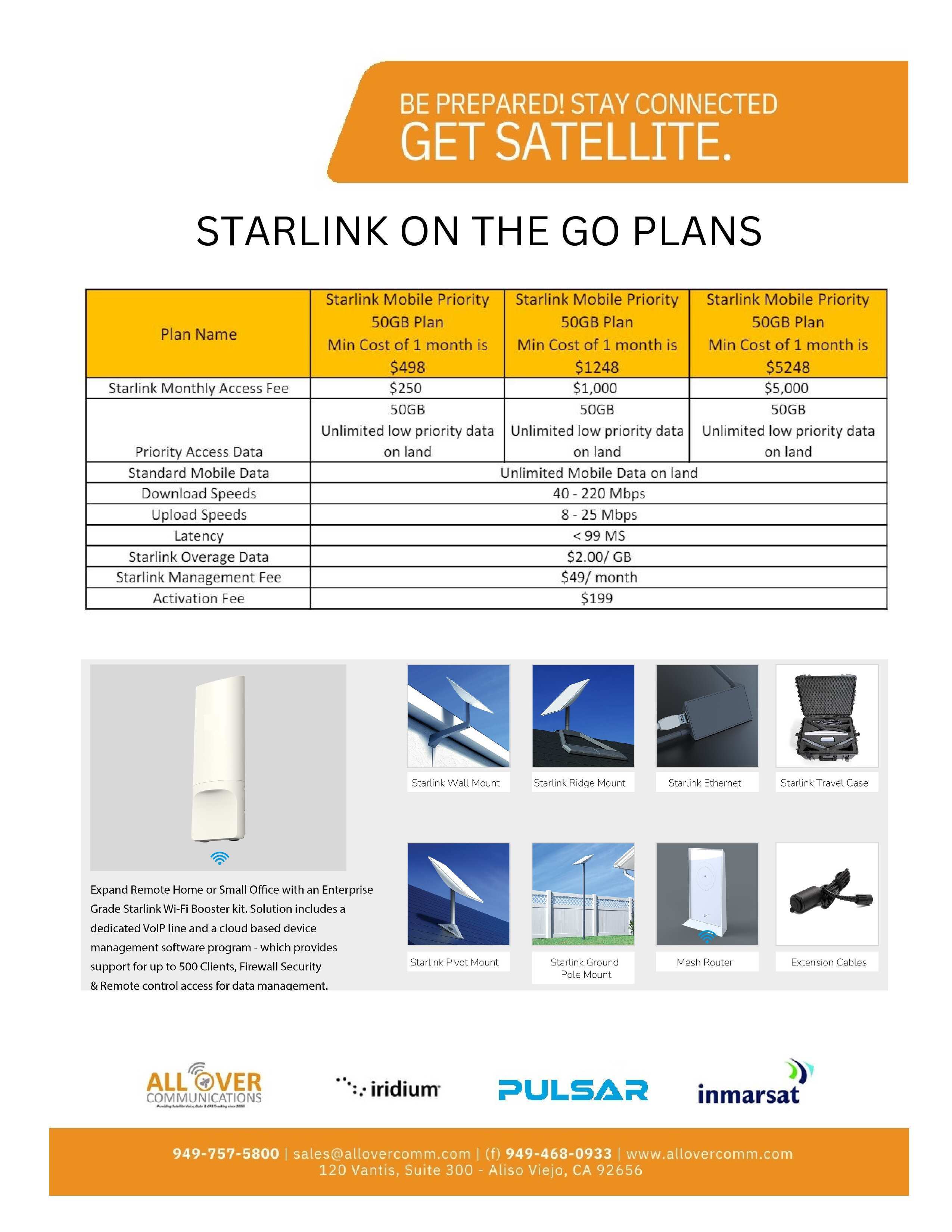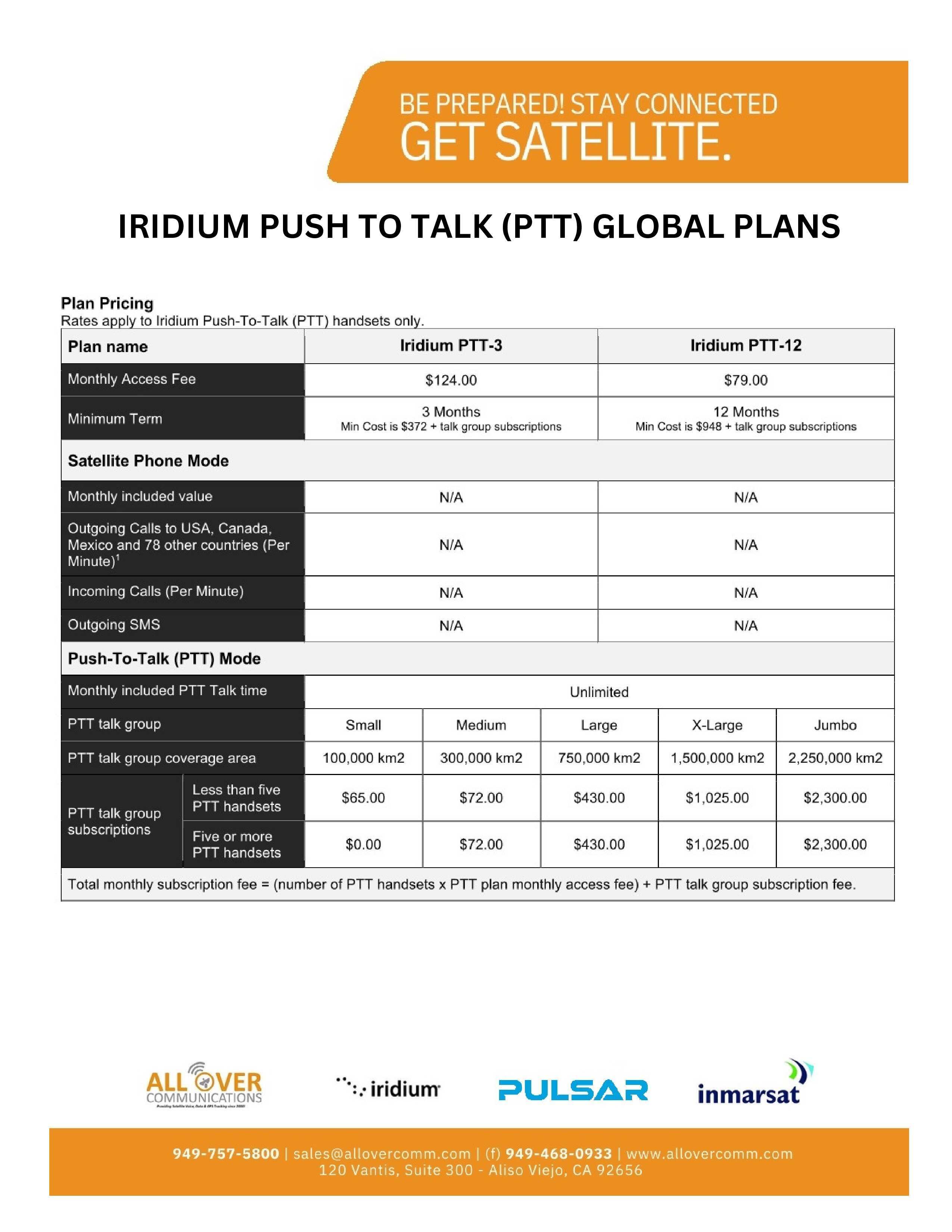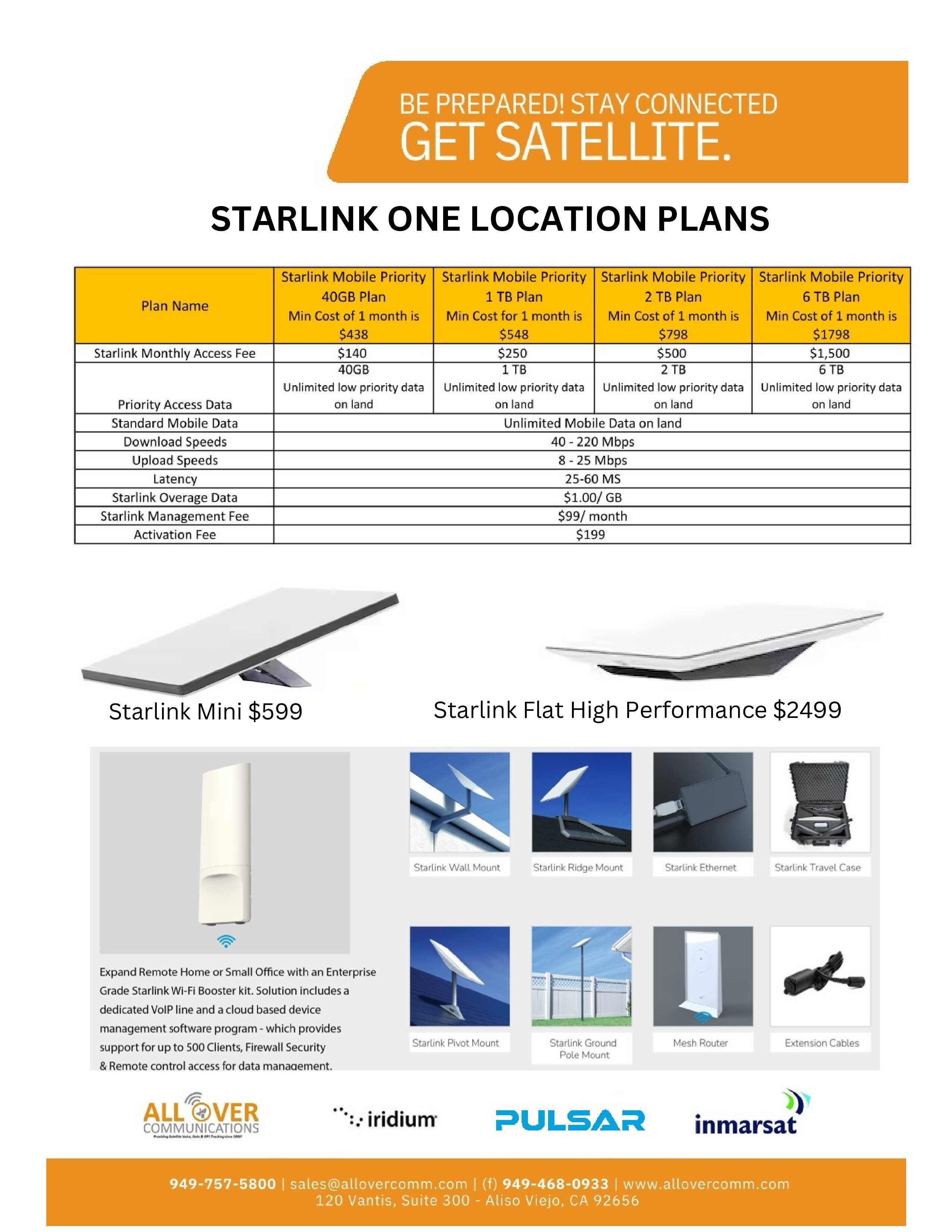 All Over Communications provides airtime billing solutions for several voice & data products. Most devices require SIM cards and we provide them for free with activation. Most plans don't have an activation fee but may require a contract. We offer Iridium voice rate plans, Iridium Certus (data) plans, Iridium Push-to-talk Plans, Inmarsat voice plans, Inmarsat BGAN plans, Inmarsat Fleet Broadband Maritime plans and Starlink Managed Data Plans